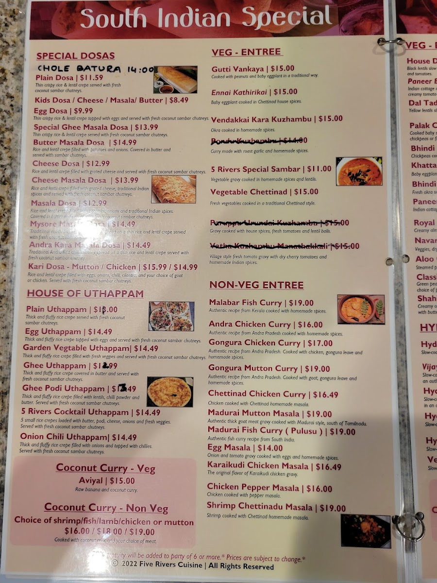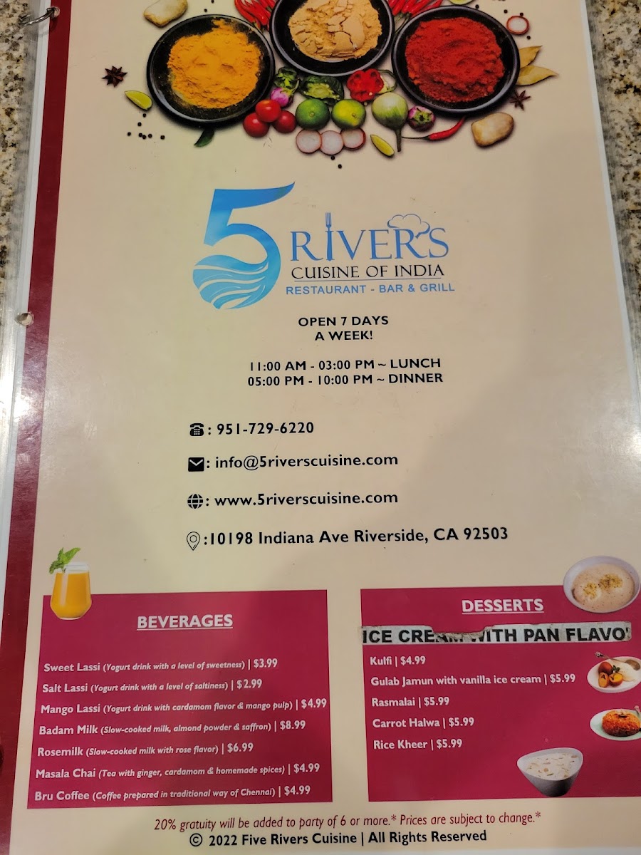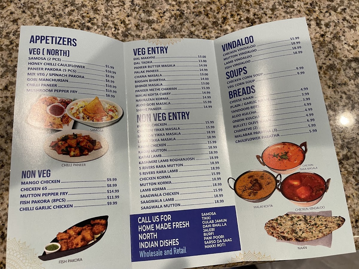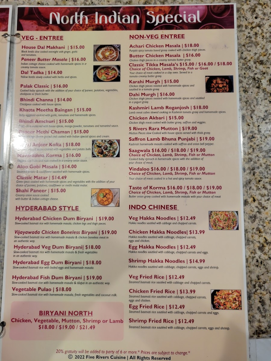 The menu at 5 Rivers Cuisine of India and Banquet Hall offers a delightful selection of both vegetarian and meat dishes, catering to a variety of tastes. For vegetarians, there are flavorful entrees like Dal Tadka, Aloo Gobi, Mixed Vegetables, Paneer Tikka Masala, and Bhindi Masala. The starters feature crispy options such as Pakora (8 PC), Paneer Pakora (8 PC), and Spinach Pakora (8 PC), alongside Masala Dosa W/ Sambar and Chana Bhatura. The restaurant’s rice specialties include fragrant biryanis like Hyderabadi Goat Dum Biryani, Vegetable Biryani, Lamb Dum Biryani, Shrimp Biryani, and Chicken Dum Biryani. Tandoori lovers can enjoy a range of specialties including Chicken Seekh Kebab, Tandoori Chicken, Tandoori Shrimp, and Mixed Tandoori Platter, along with Tandoori Paneer for vegetarians. To accompany the main dishes, there are fresh breads like Lachha Paratha (3), Garlic Naan, Cheese Naan, and Tandoori Roti, as well as refreshing beverages such as Salty Lassi, Sweet Lassi, Mango Lassi, and sodas. For those with a sweet tooth, the dessert selection includes Gulab Jamun and Rasmalai. The meat entrees include classics like Butter Chicken, Chicken Kadhi, Lamb Vindaloo, Lamb Saag, and Chicken Vindaloo, while meat starters feature flavorful options like Butter Chicken Wings, Shrimp Pepper Fry, Amritsari Fish Pakora, and Lamb Keema Pav. Each dish promises an authentic and satisfying Indian dining experience.