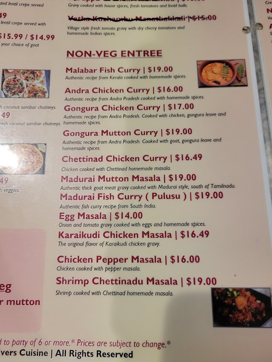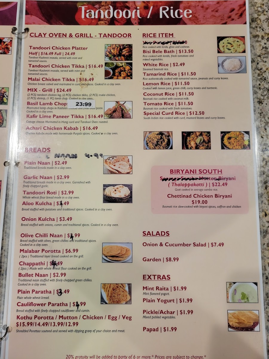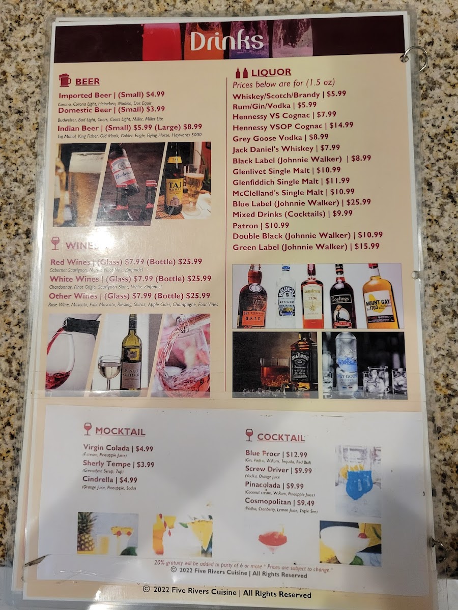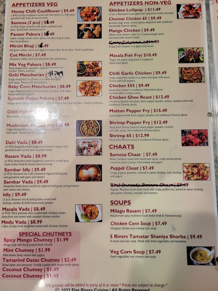 The menu at 5 Rivers Cuisine of India and Banquet Hall offers a delightful selection of both vegetarian and meat dishes, catering to a variety of tastes. For vegetarians, there are flavorful entrees like Dal Tadka, Aloo Gobi, Mixed Vegetables, Paneer Tikka Masala, and Bhindi Masala. The starters feature crispy options such as Pakora (8 PC), Paneer Pakora (8 PC), and Spinach Pakora (8 PC), alongside Masala Dosa W/ Sambar and Chana Bhatura. The restaurant’s rice specialties include fragrant biryanis like Hyderabadi Goat Dum Biryani, Vegetable Biryani, Lamb Dum Biryani, Shrimp Biryani, and Chicken Dum Biryani. Tandoori lovers can enjoy a range of specialties including Chicken Seekh Kebab, Tandoori Chicken, Tandoori Shrimp, and Mixed Tandoori Platter, along with Tandoori Paneer for vegetarians. To accompany the main dishes, there are fresh breads like Lachha Paratha (3), Garlic Naan, Cheese Naan, and Tandoori Roti, as well as refreshing beverages such as Salty Lassi, Sweet Lassi, Mango Lassi, and sodas. For those with a sweet tooth, the dessert selection includes Gulab Jamun and Rasmalai. The meat entrees include classics like Butter Chicken, Chicken Kadhi, Lamb Vindaloo, Lamb Saag, and Chicken Vindaloo, while meat starters feature flavorful options like Butter Chicken Wings, Shrimp Pepper Fry, Amritsari Fish Pakora, and Lamb Keema Pav. Each dish promises an authentic and satisfying Indian dining experience.
